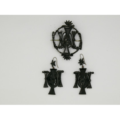 Antica demi parure in metallo giaietto e smalto composta da spilla e paio di orecchini.1850 ca. In scatola di Codognato-Venezia