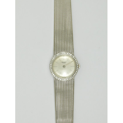 Orologio Jean Perret in oro bianco, cassa rotonda ornata di diamanti taglio huit-huit.bracciale in tessuto .1970 ca