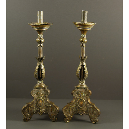 Coppia di candelieri ad una fiamma con fusto in legno ricoperto in rame argentato decorato in rilievo a foglie e volute, sec. XIX