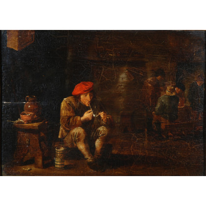 Seguace di David Teniers II - Olanda, sec. XVII, "Interno di osteria con fumatore di pipa", olio su tavola (cm 24x33,5). In cornice dorata.