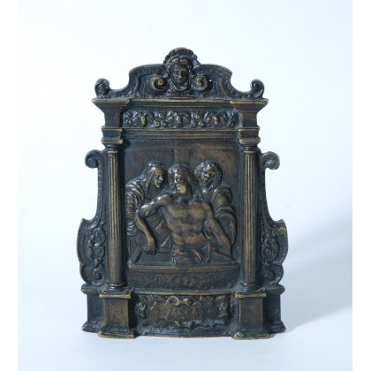 Pace in bronzo a bassorilievo raffigurante la Deposizione entro cornice a tempietto con cimasa figurata e montanti sagomati. Parte inferiore con cartiglio iscritto. Impugnatura sagomata. Sec. XVII.