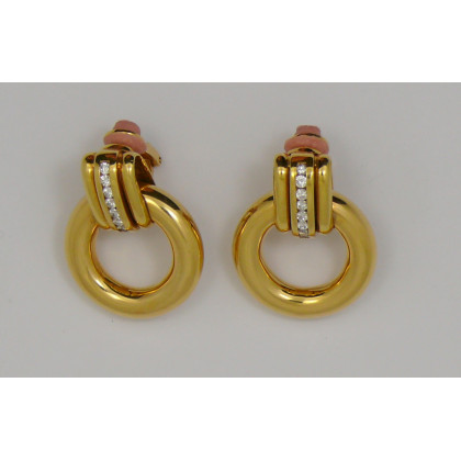 Paio di orecchini di Faraone in oro giallo con motivo ad anello impreziosito da diamanti di ct 0.61 complessivi. gr 28.50. Firmati Faraone