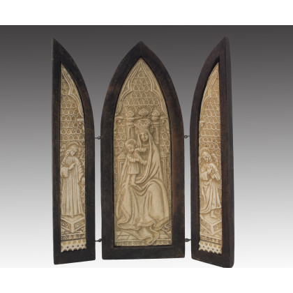 Arte del sec. XIX Trittico in avorio inciso raffigurante Madonna con bambino e angeli, montato in custodia di pelle