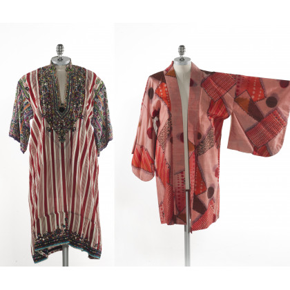 Lotto composto da tre abiti di foggia orientale in tessuti diversi ricamati (difetti)