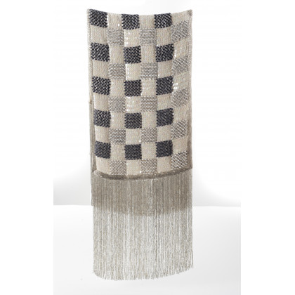 Laura Biagiotti (etichetta mancante): stola da sera, in tessuto interamente ricamato a scacchi color argento, blu e panna, fodera in chiffon, bordi con lunghe frange in canottiglie di vetro color argento