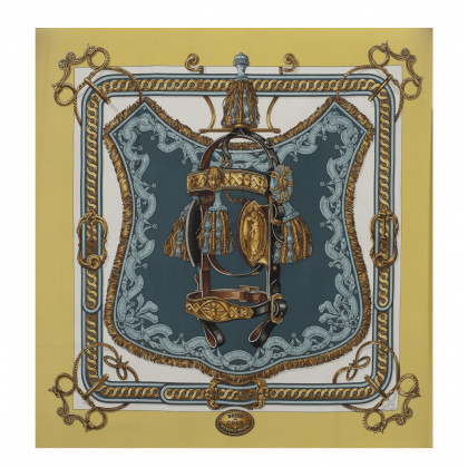 Hermès: carrè in seta stampa 'Bride de Cour', firmato F. de La Perrière, briglie con nappe e fibbie color carta da zucchero, oro e marrone su fondo bianco, bordo senape