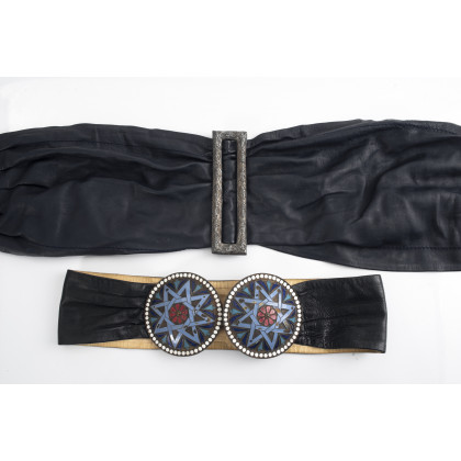 Lotto composto da due cinture in pelle color blu e nero, con grandi fibbie in metallo, smalti e argento lavorato (difetti)
