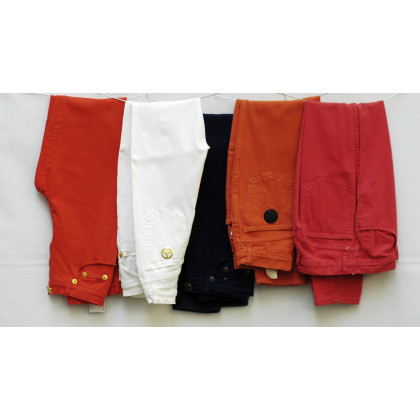 Moschino: lotto composto da cinque paia di jeans cinque tasche in cotone, diverse tonalità di arancio, blu e bianco, taglie diverse (difetti)