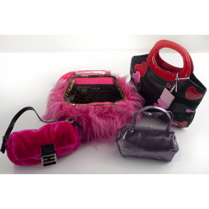 D&G Dolce e Gabbana e anonimi: lotto composto da due borse in ecopelliccia e peluche color fucsia con tracolla, una borsa nera con cuori e manici in vernice color rosso e rosa, ed una borsetta in tessuto viola lamè, (difetti)