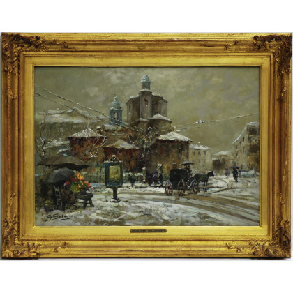 Pittore lombardo del XIX secolo "Milano sotto la neve" olio su tela (cm 50x70) Reca firma Solenghi in basso a sinistra