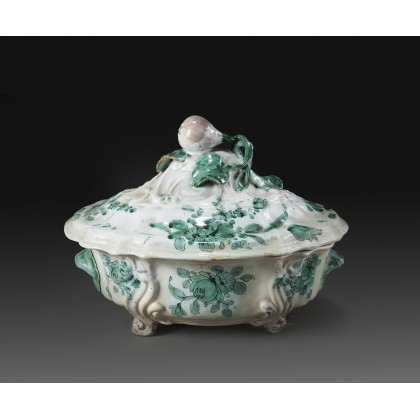 Zuppiera in maiolica sagomata e costolata con decorazione a fiori in monocromia verde. Coperchio con presa a frutto (cm 30x25). Area campana, Cerreto Sannita, sec. XVIII (estesi restauri) Ribbed maiolica tureen with cover. Campania, Cerreto Sannita, 18th century (important restorations)