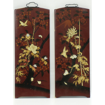 Arte orientale. Coppia di pannelli in lacca decorati in rilievo con fiori in osso e madreperla (difetti)