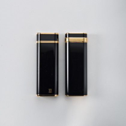 Cartier two gold plated and black lacquered lighters, in original cases (cm 7x2.50x1.20) Marks of Cartier-Paris-Plaque or - Swiss Made- N. 60902X and N. 88236X