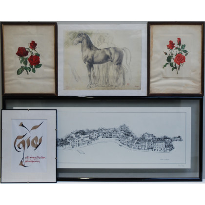 Lotto composto da quattro riproduzioni ed un acquerello, in cornici, misure diverse