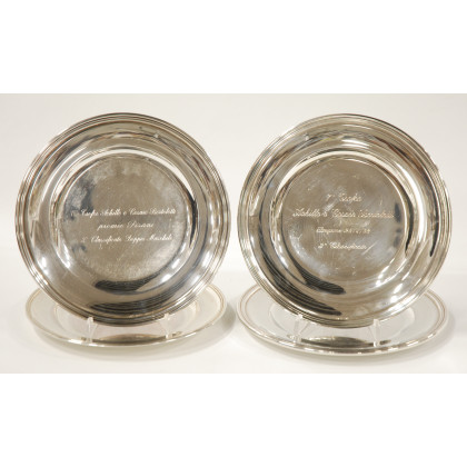 Gruppo di quattro piatti tondi in argento a bordo scanalato (gr 800)