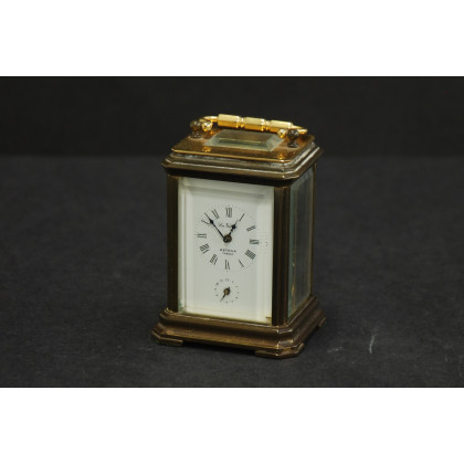 Piccola pendulette d'officier in metallo dorato, quadrante in bianco in XII romani e sveglia. Firmato La Vallée e Astrua Torino, XX secolo (h. cm 9) (schegge in basso a sinistra nel cristallo molato)