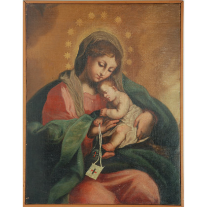 Scuola emiliana del sec XVIII "Madonna con bambino", olio su tela (cm 69x53) In cornice (difetti)
