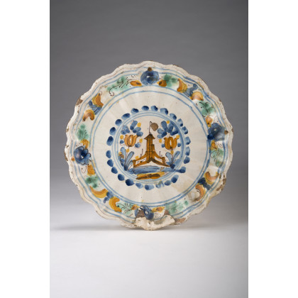 Crespina in maiolica costolata e sagomata su basso piede con decorazione policroma a gran fuoco e decoro centrale a castelletto; sul bordo ghirlanda vegetale stilizzata. Sec XVIII (d cm 28,8) (rotture)
