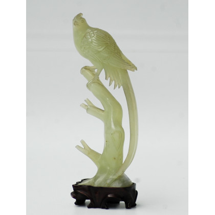 Arte cinese. Scultura in pietra serpentine raffigurante uccello del paradiso poggiante su ramo. (h cm 19,5) Base in legno.