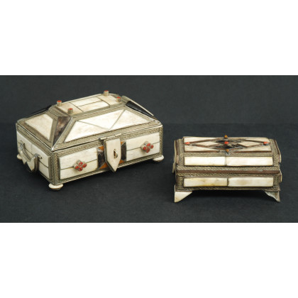 Lotto composto da due scatole orientali con coperchio orientali in rame inciso e decorato con placche in avorio e pietre dure. Sec. XIX. (difetti e mancanze) (misure diverse)