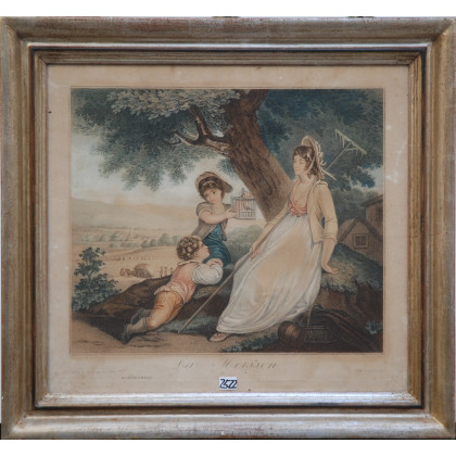 Litografia francese a colori raffigurante "Figure all'aperto" (cm 39x43.5) In cornice (Difetti) French colour lithography of "Figure all'aperto". Framed (defects)