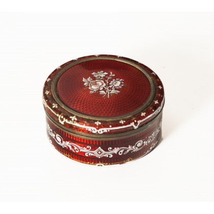 Scatola rotonda in argento smaltato a fondo rosso e decorato a motivi floreali con giglio di Francia. Sotto il coperchio reca miniatura di dama (d cm 8,4). Francia, sec. XIX (lievi difetti)