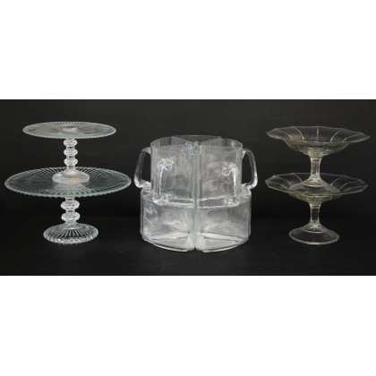 Lotto composto da quattro alzatine portafrutta e quattro brocche in vetro (lievi difetti)