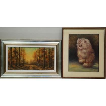 Due dipinti ad olio, misure diverse, raffiguranti gatto e paesaggio. Firmati, in cornice