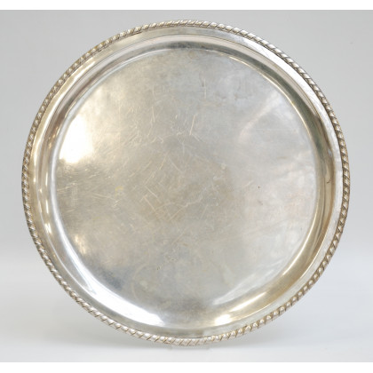 Vassoio di forma tonda in argento con bordo lavorato (gr 1600 ca) (lievi difetti)