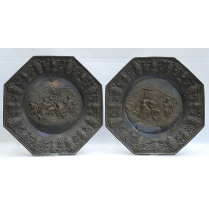 Coppia di piatti ottagonali da parete in rame sbalzato a scene d'osteria (cm 58x58) (lievi difetti)