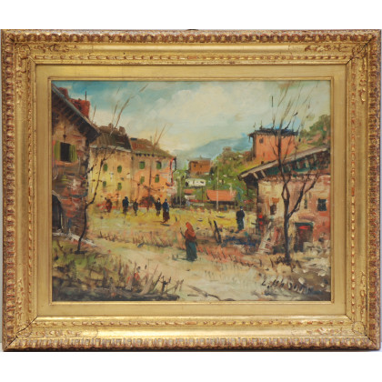 Firma indecifrata. "Scorcio di paese con figure" olio su tela (cm 40x50) Firmato in basso a destra, in cornice