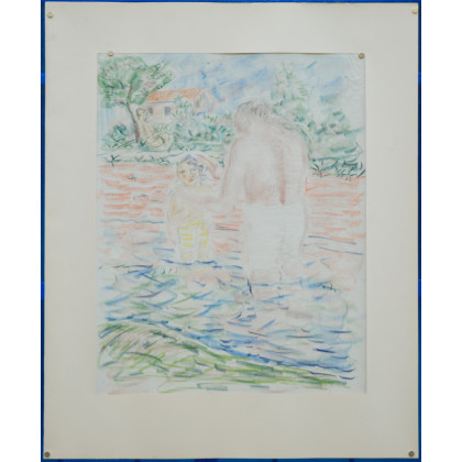 "In piscina" disegno a matite colorate su carta (cm 58x46) Firmato in basso a destra. Al retro timbro "Monsterzegel Amsterdam"