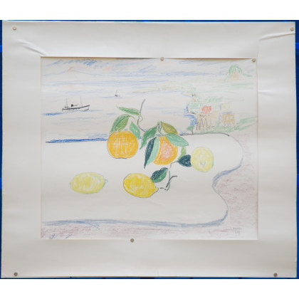"Natura morta con paesaggio sullo sfondo" disegno a pastelli colorati su carta (cm 49,5x59,5) Firmato a datato 929 in basso a destra