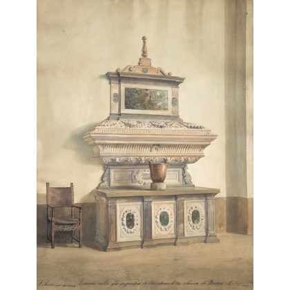 "Lavabo nella già sacrestia della demolita chiesa di Brera" 1859, acquerello su carta (cm 52.7x40) Firmato e datato in basso a destra, iscritto sul fondo