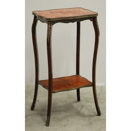 Tavolino rettangolare con piano in marmo, gambe sagomate riunite da pianetto (cm 40x77x33)