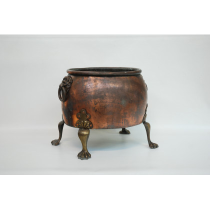 Cache-pot biansato in rame con anse a teste di leoni e piedi sagomati in bronzo