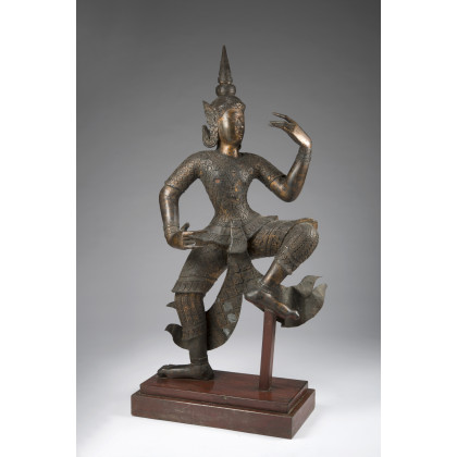 Scultura in legno dorato e con applicazioni in pasta di vetro raffigurante un devata danzante poggiante su base in legno laccata a fondo rosso. Tailandia, secc. XIX-XX. (h cm 146) (difetti) Gilt-wood sculpture with vitreous inclusions, representing a devata dancer on a red ground lacquered wooden base. Thailand, 19th/20th century (defects)