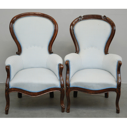 Lotto di due poltrone "Luigi Filippo" in noce con montanti e gambe sagomate