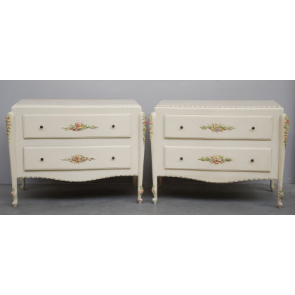 Coppia di comò a due cassetti in legno laccato bianco decorati a fiori policromi intagliati (cm 122x92x64)(difetti)