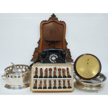 Lotto composto da un vecchio telefono, un fornelletto per crepes in metallo argentato, una meridiana, una scatola contenente scacchi in legno intagliato e un'alzata di comodino (difetti)