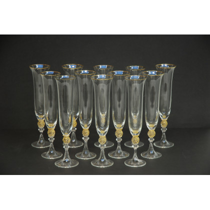 Lotto composto da dodici flutes in vetro decorato con bordo dorato (difetti)