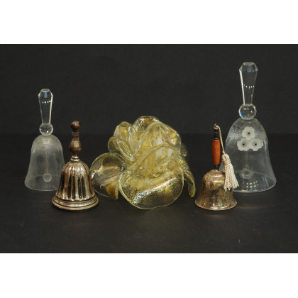 Lotto composto da due campane in vetro e due in metallo con un candeliere in vetro a forma di rosa, misure diverse (difetti)