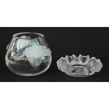 Manifattura di Laique, Francia, produzione recente. Lotto composto da un vaso "Orchidèe" in vetro trasparente con motivo di orchidee satinate, firmato alla punta sotto la base, ed un posacenere "Cannes" in vetro trasparente e satinato , firmato alla punta sotto la base.