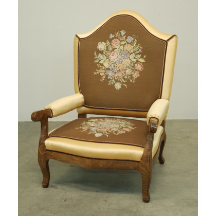 Grande poltrona in legno, gambe e braccioli mossi, imbottitura con stoffa a decoro floreale, (cm 83x110x75) sec. XX (piccoli difetti)