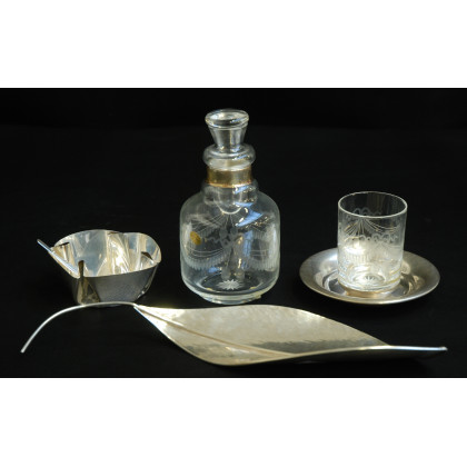 Lotto composto da una bottiglia da notte, una zuccheriera e una foglia in argento e vetro
