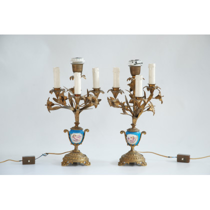 Coppia di candelieri in bronzo e porcellana a quattro luci con bracci a rami fioriti (lievi difetti)