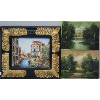 Lotto di tre dipinti raffiguranti paesaggi di cui uno in cornice