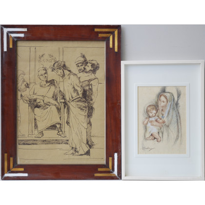 Lotto composto da un disegno e una litografia a soggetto religioso, in cornici.