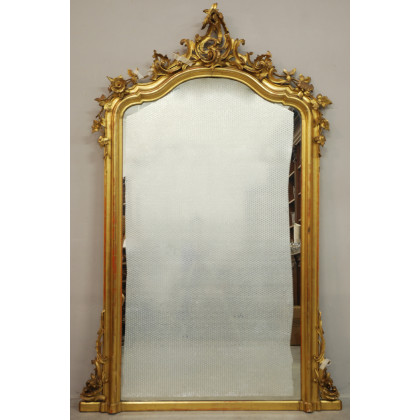 Caminiera di forma sagomata in legno dorato con cimasa e montanti riccamente intagliata e traforata a motivi vetali. Sec XIX (cm 130x197) (difetti)