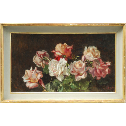"Rose" olio su compensato (cm 37x65) Firmato in basso a destra. In cornice (difetti)